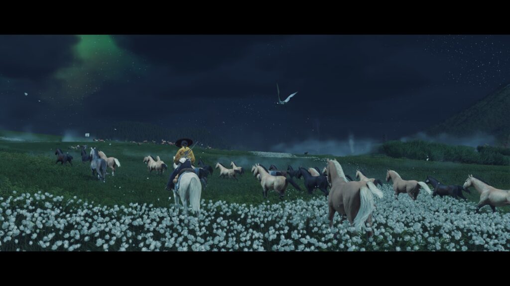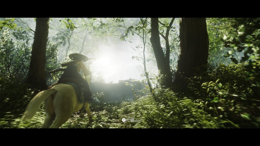 ちなみに、足元の白い花のエリア上は馬で駆けている際にスピードアップすることができる新機能が。