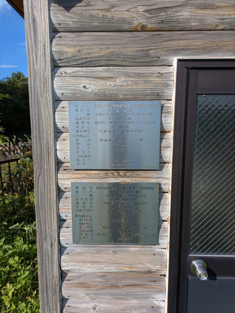 池の名前は不明だが、事業内容や池のスペックが刻まれているプレートには「両堤地区」と表されている。
