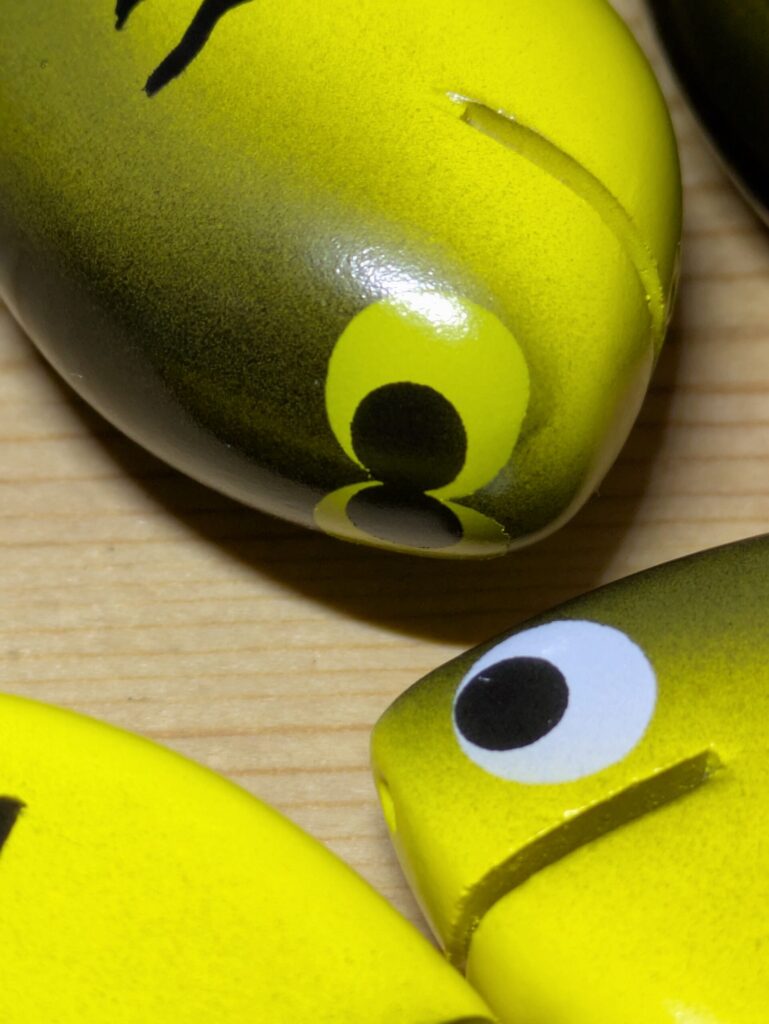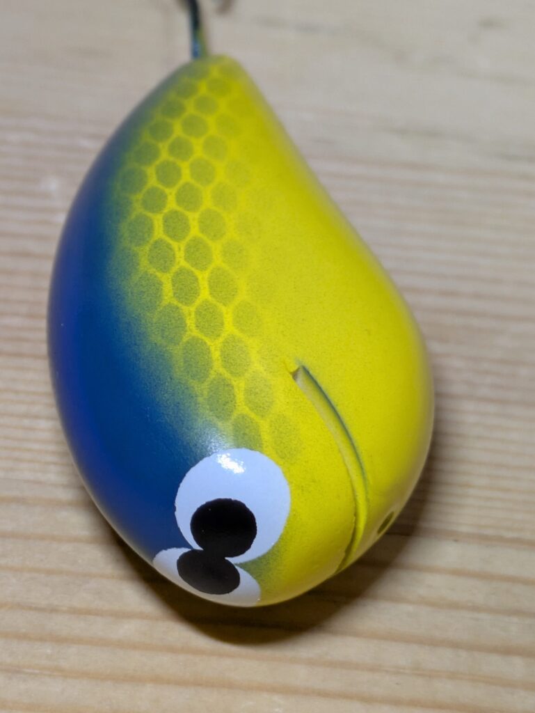 試作の丸形クランクベイト(全長50mm)は、アイを塗装したらとても可愛らしい見た目に変貌。