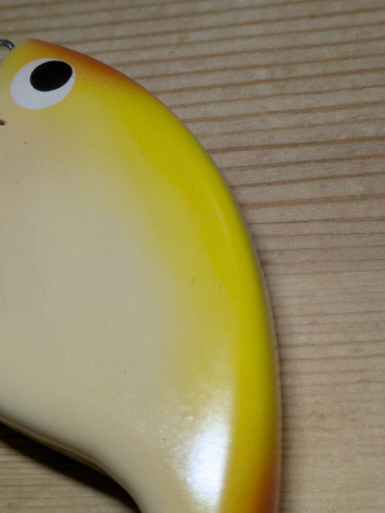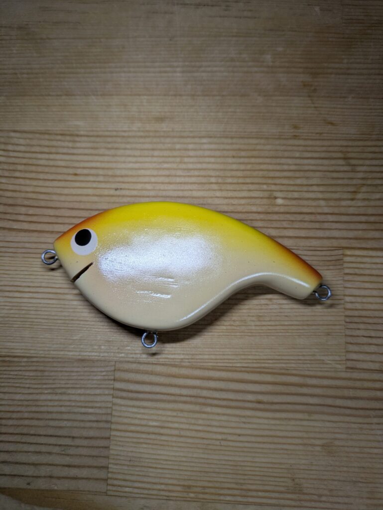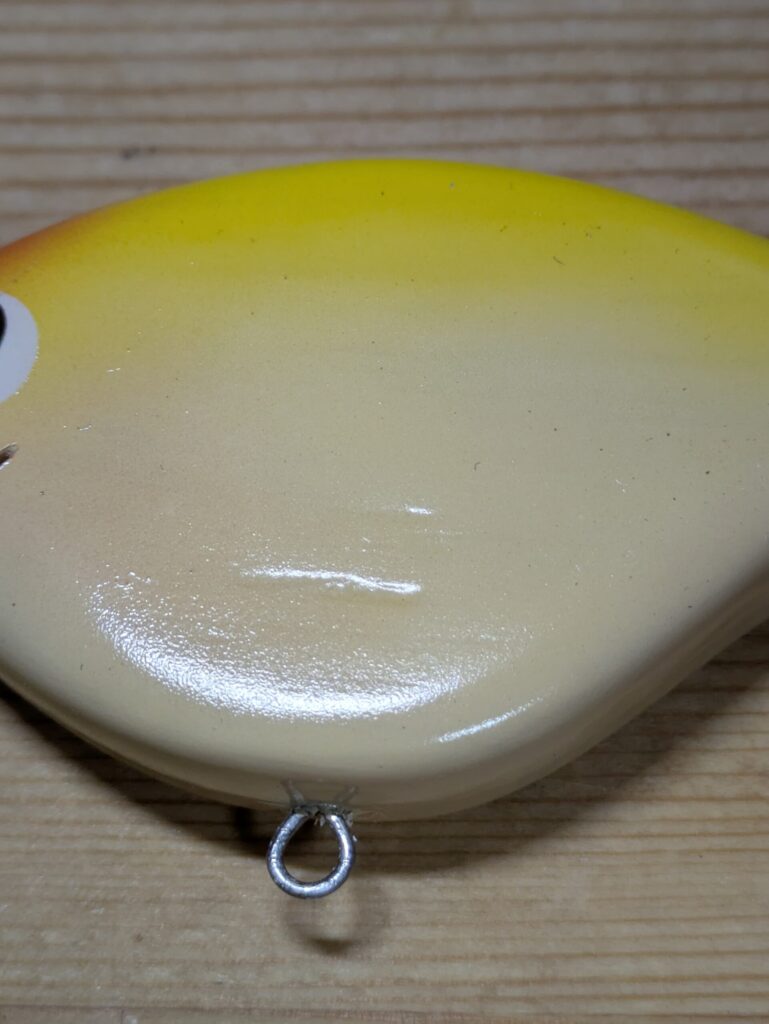 目玉は黄色が直径7mm、黒目が直径4mm。最近良く作っている67mmフラットサイドクランクと同じサイズで塗りました。