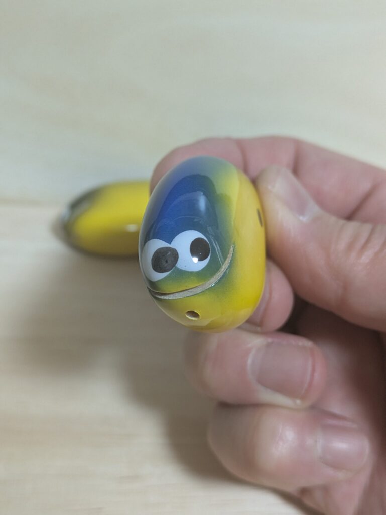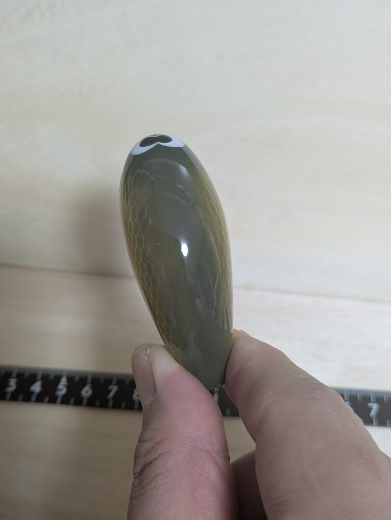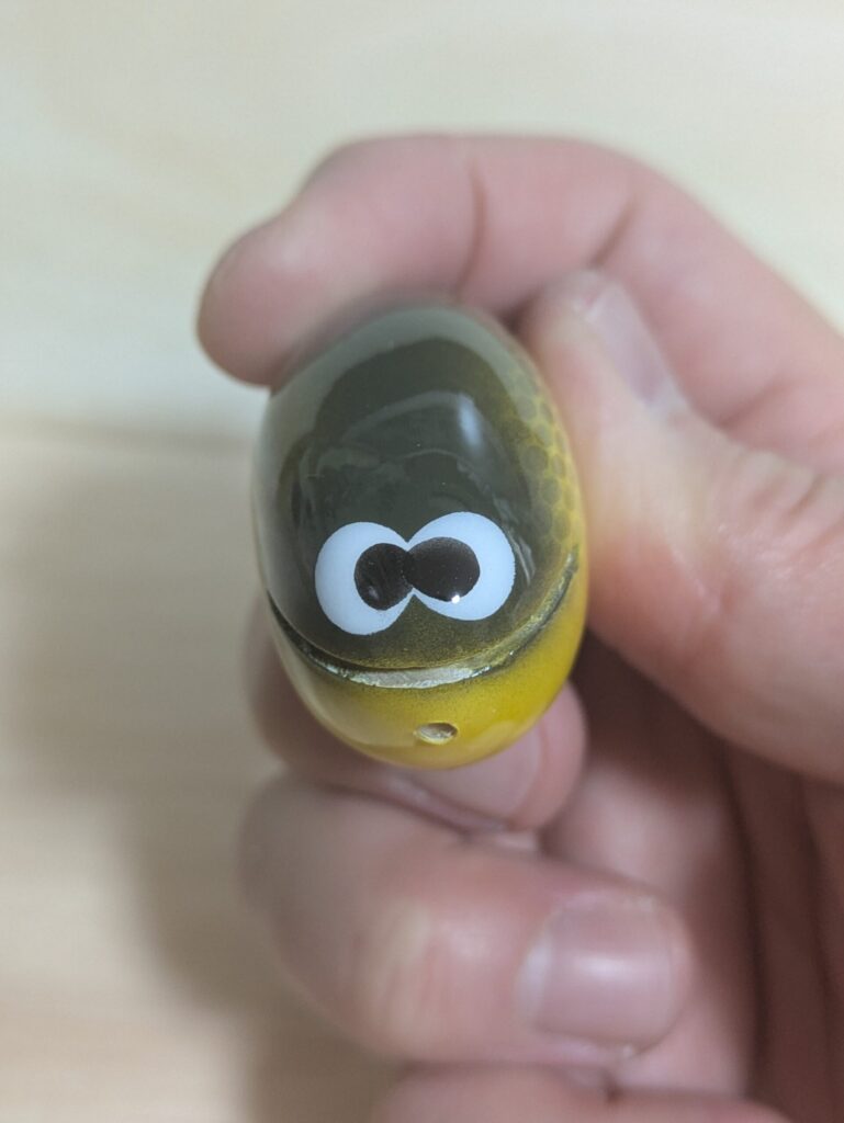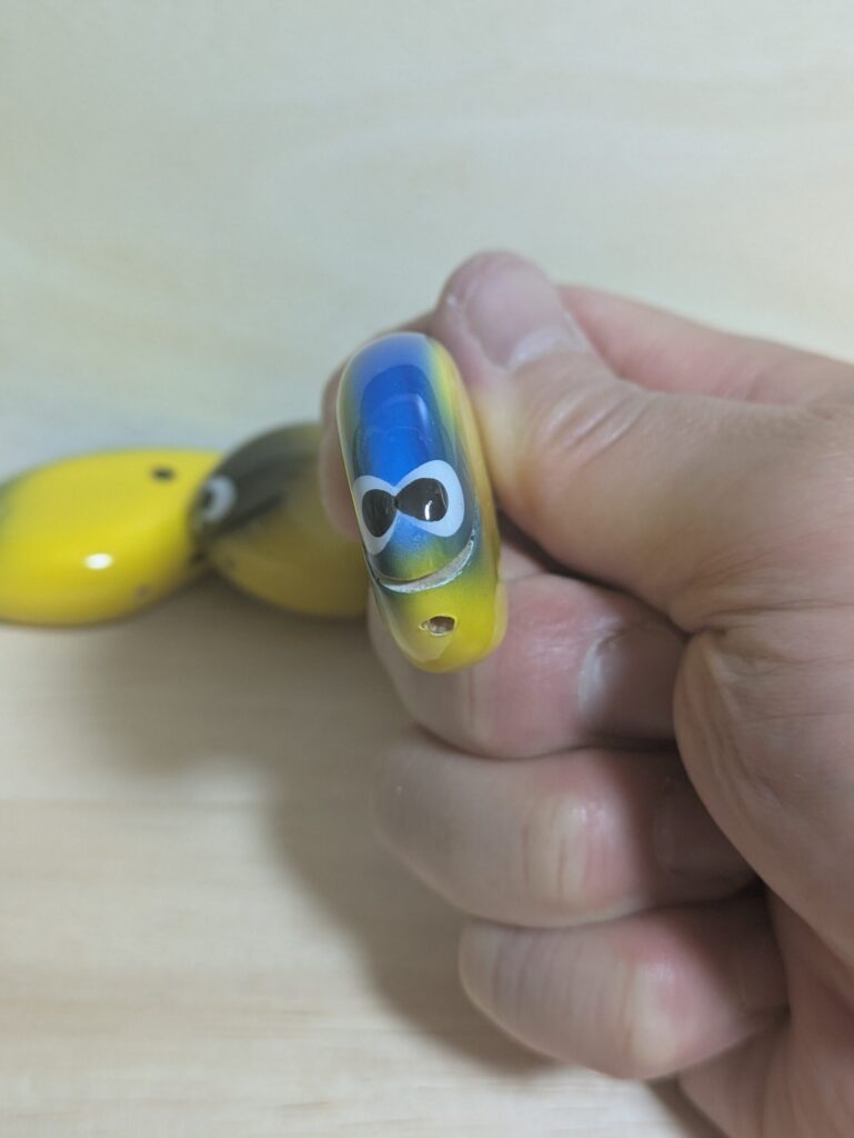 セルロースセメントへのディッピング後、頭を下向きに吊るしておいたため、ちょうど目玉部分に雫が溜まりました。