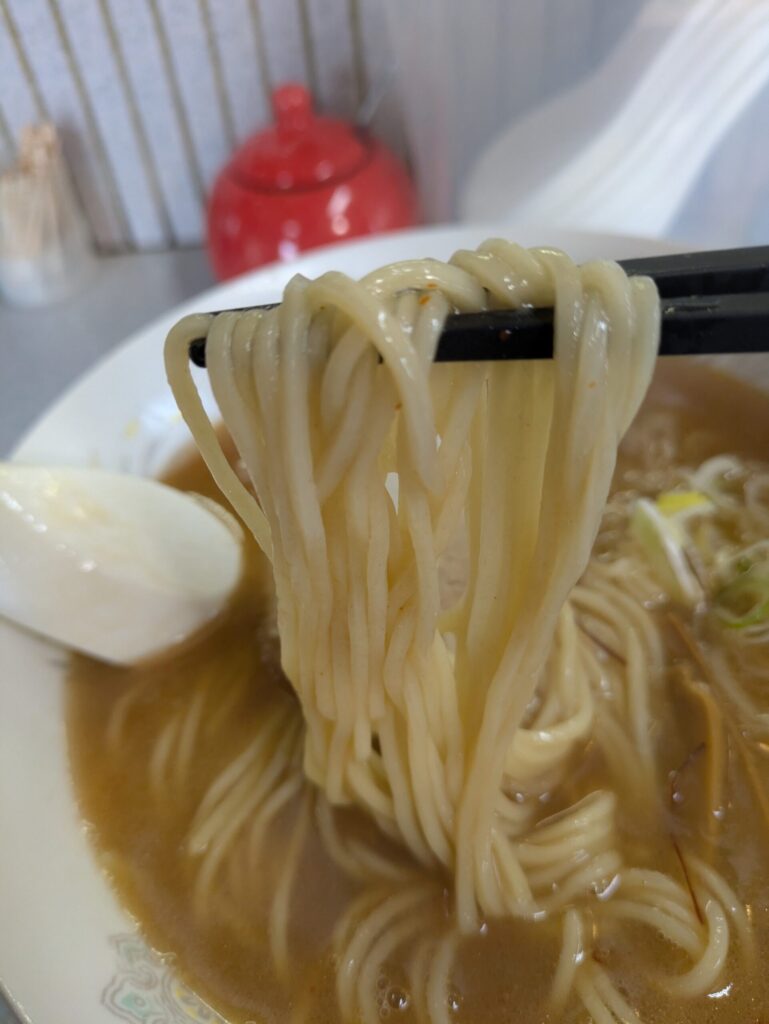 煮干し系メニュー等とは違い、やや黄色みがかった細麺。
