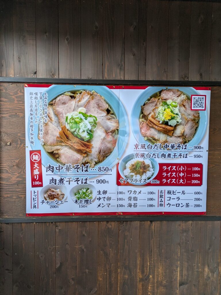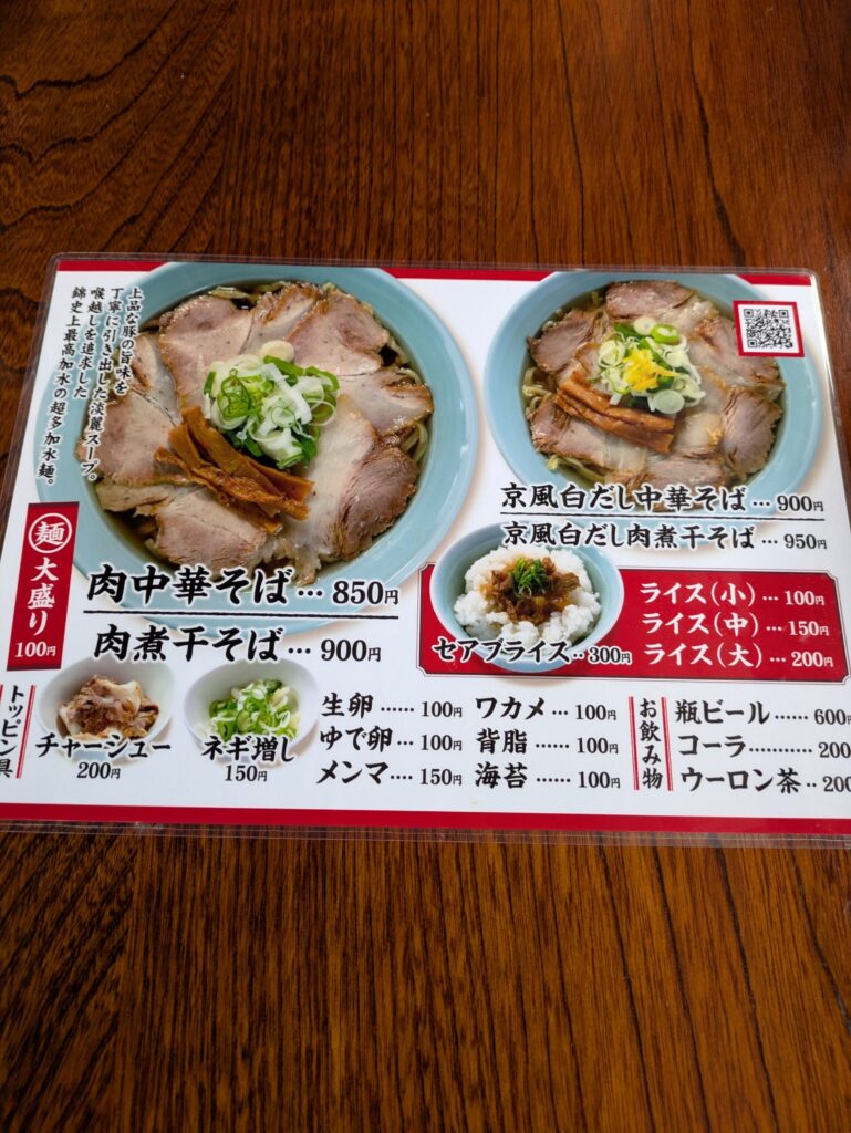 大別すると「中華そば」「煮干そば」「京風白だし中華そば」「京風白だし煮干しそば」の4種となるようです。
