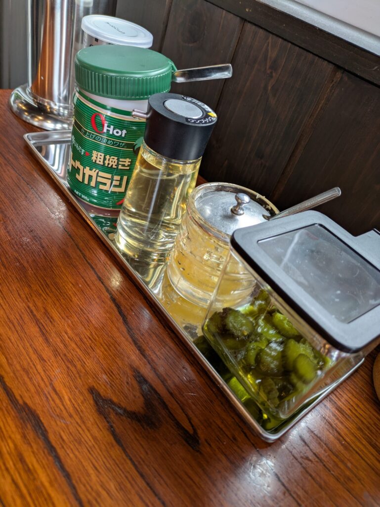 卓上にはラーメンこしょう・粗挽きトウガラシ・酢・ニンニク(だと思う)・そしてカッパ漬け。