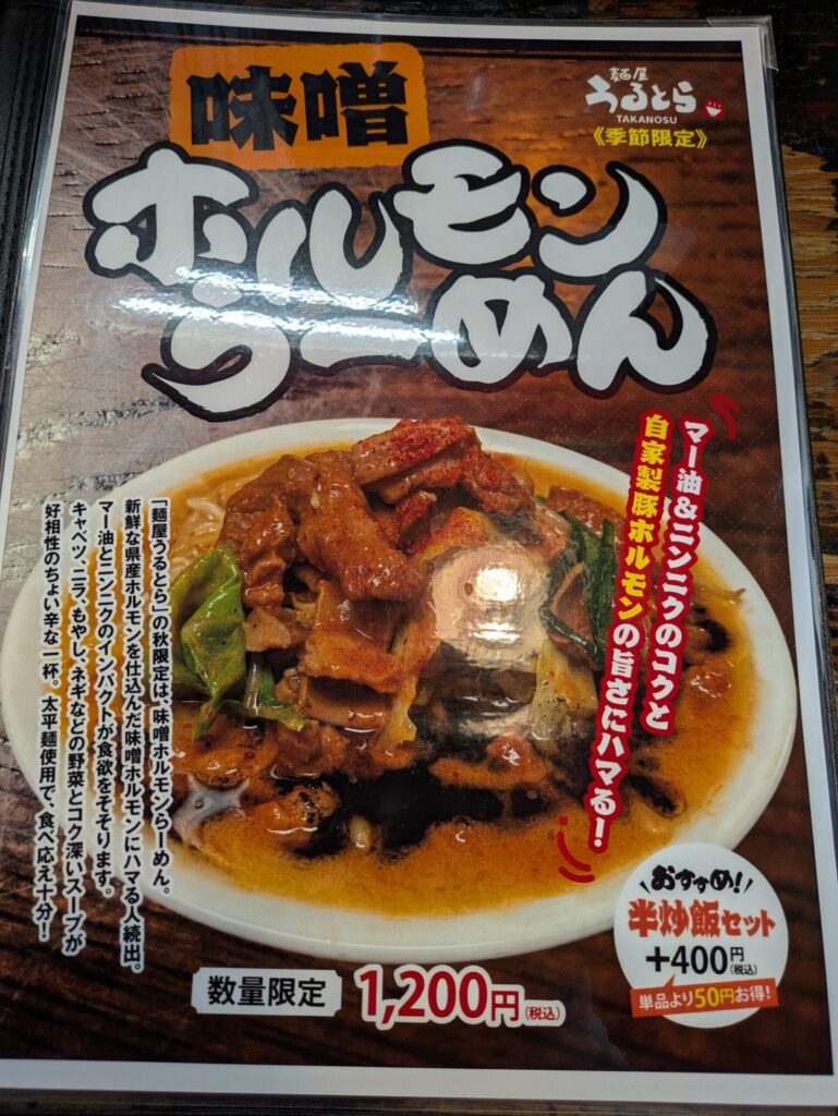 シーズン限定メニューが更新されておりました。秋冬提供の麺は「味噌ホルモンらーめん」。