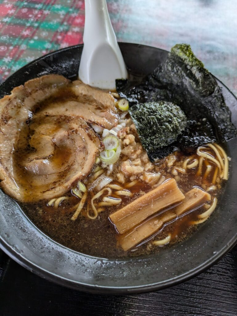 メンマ・海苔・チャーシュー・ネギというシンプルな構成ですが、スープの醤油色は濃くコッテリそうな見た目。