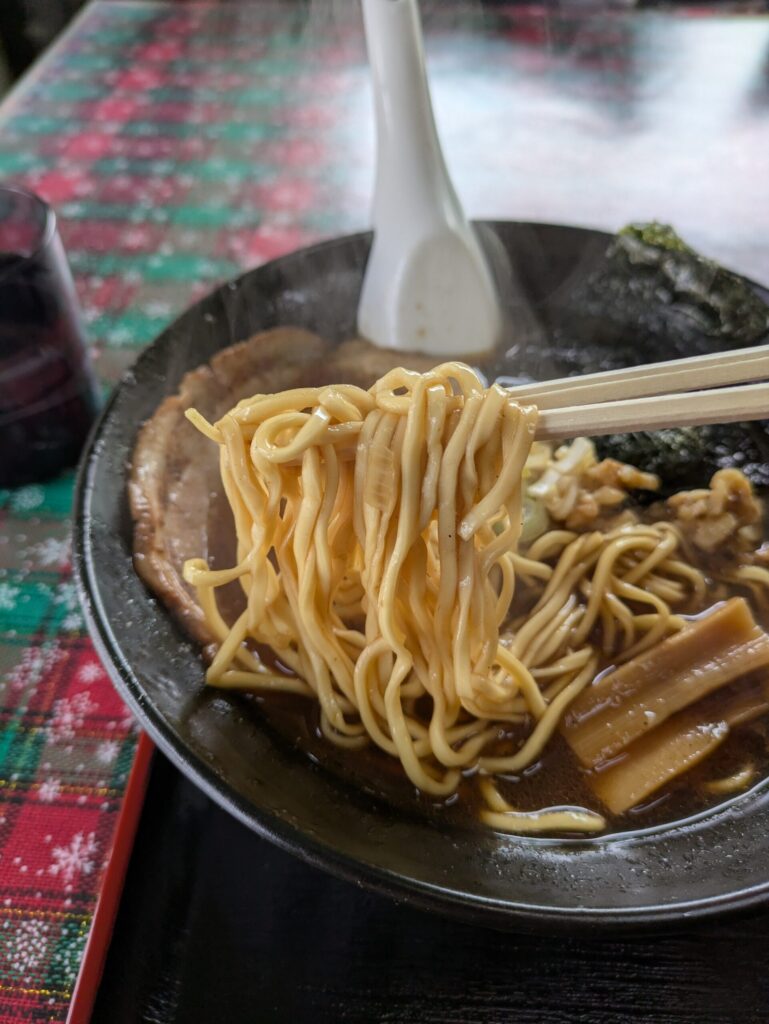 平打ちストレートの麺は低加水なのでしょうか、硬めで張りがありポキポキ食感。