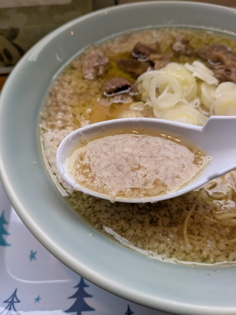細かな背脂と油が表面を覆いつくし、テラッテラに外光を反射しています。