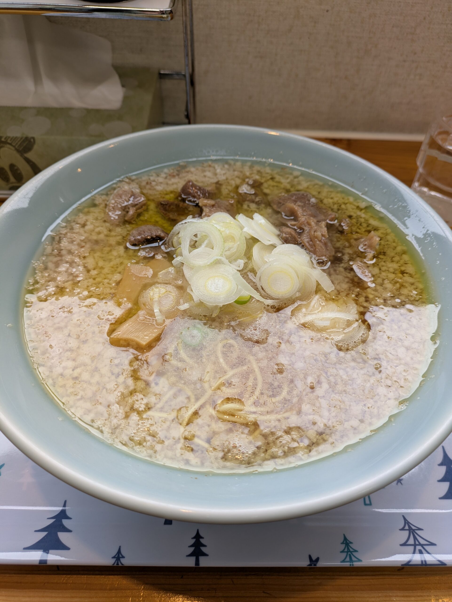 細かな背脂と油が表面を覆いつくし、テラッテラに外光を反射しています。