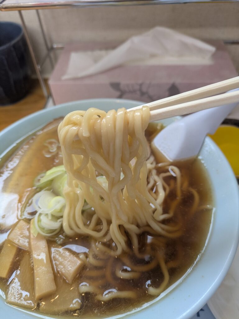 甘みと塩味が同居するいつもの馬肉ラーメンスープでは無く、煮干しを中心に据えた出汁感タップリで芳醇な醤油スープ。