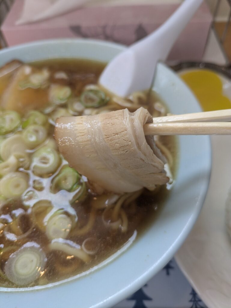 バラ肉チャーシューは、箸で持ち上げると崩れてしまうほど柔らかく煮込まれていた。