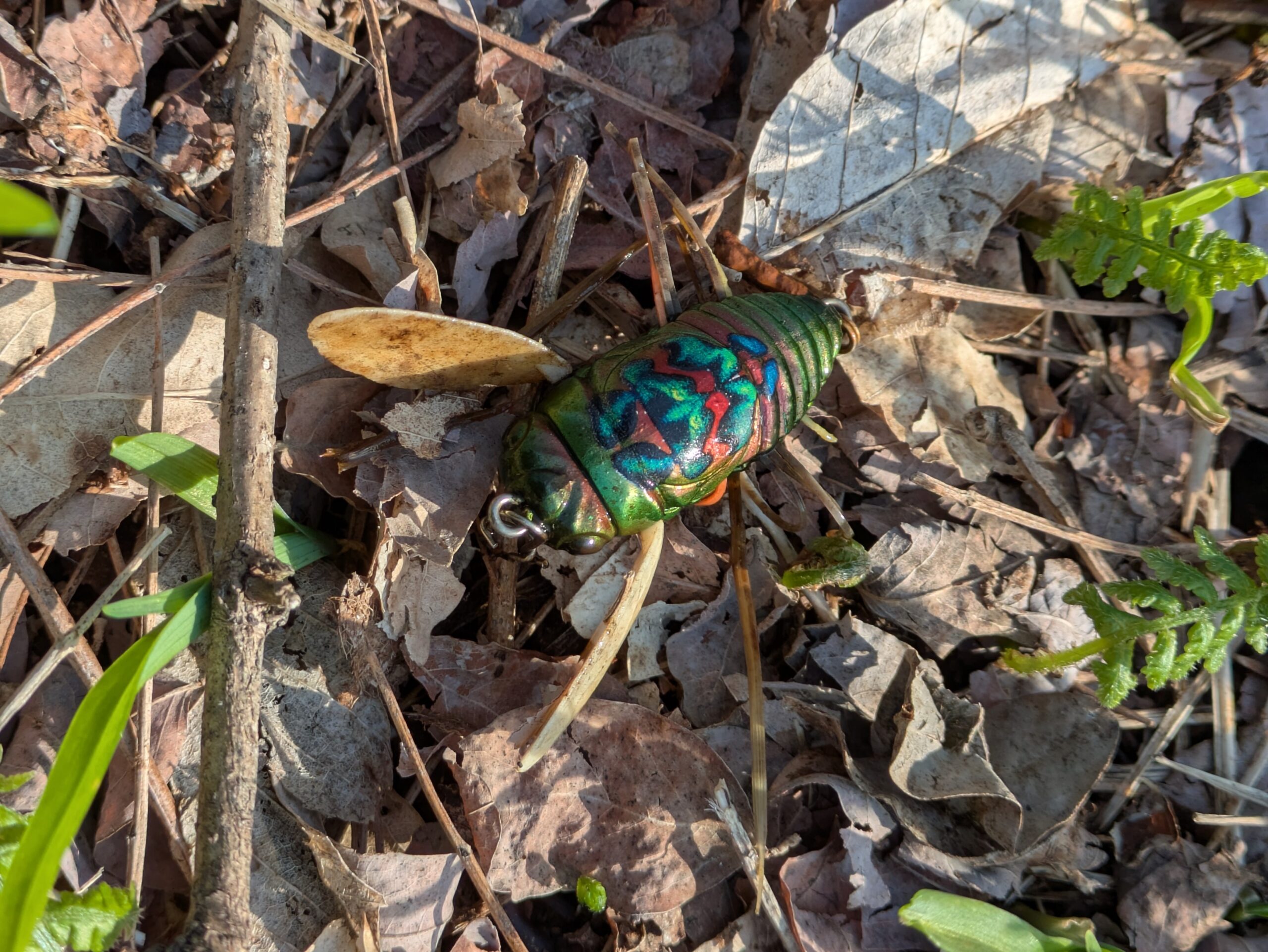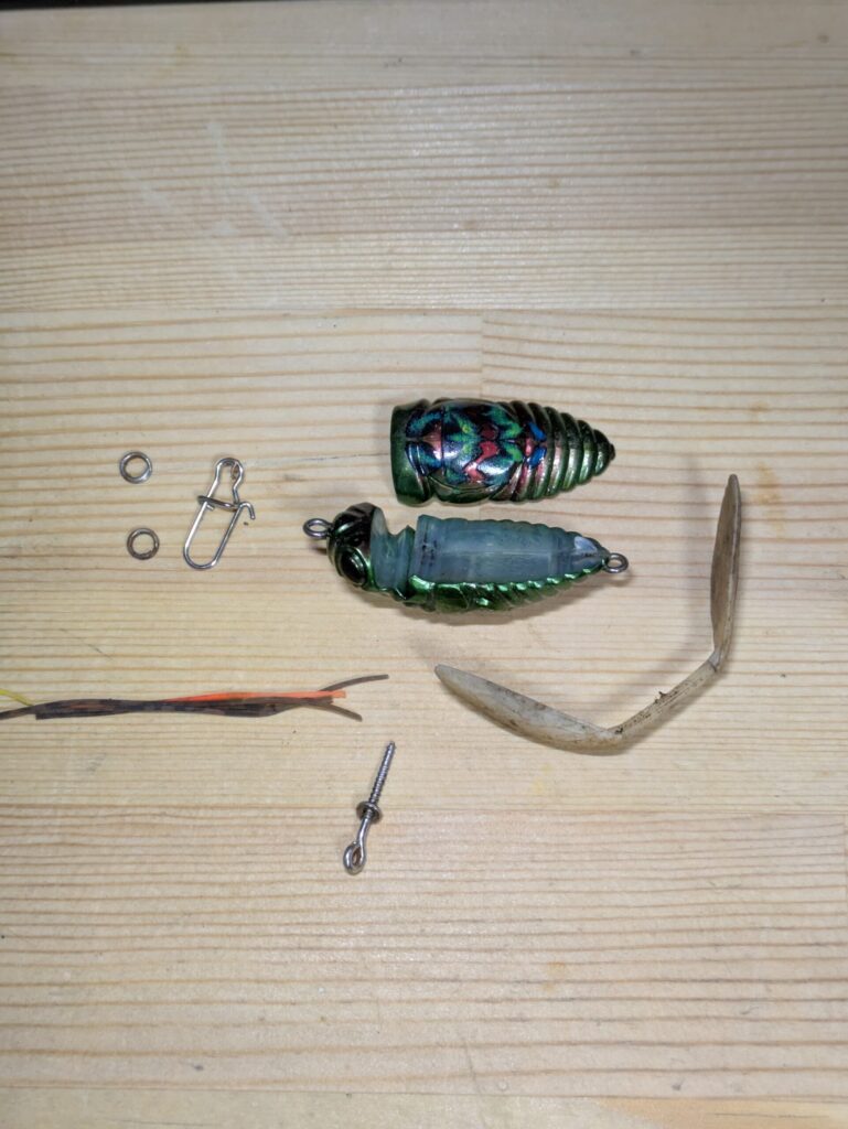 水辺を注視しながらゴミを探し集めているとセミの亡骸を発見。手に取って確かめてみると、正体は虫系のルアー。